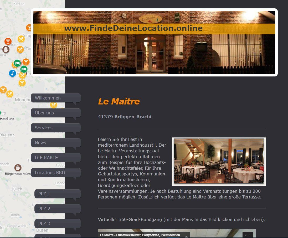 Anfang 2016 hatten wir die Idee für ein Online-System, dass die Suche nach Miet-Räumlichkeiten für Veranstaltungen vereinfacht. Auf unserer "Party-Locations-Map" ("Party-Raum-Karte") fand man verschieden große Veranstaltungs-Orte wie z.B. Fest- oder Ball-Saal oder Scheune, Halle, Hütte, Konferenzraum usw. nach PLZ sortiert.